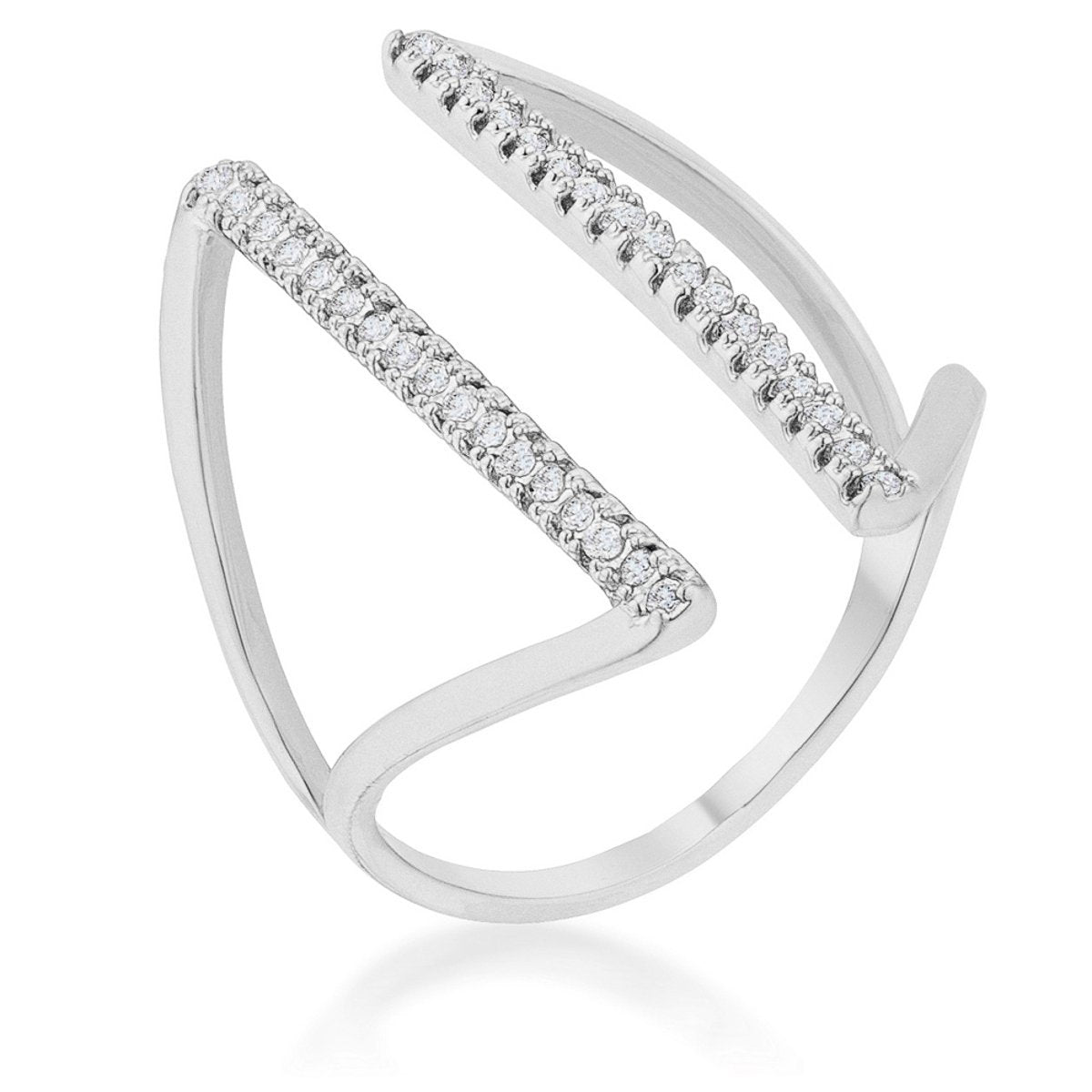 Clear stones accent the design of a contemporary open ring. Delicate and subtle -- yet makes a trendy statement. Our genuine rhodium finish is achieved using an electroplating process that coats the item with heavy layers of rhodium -- a close cousin to platinum. This gives our jewelry a platinum luster.